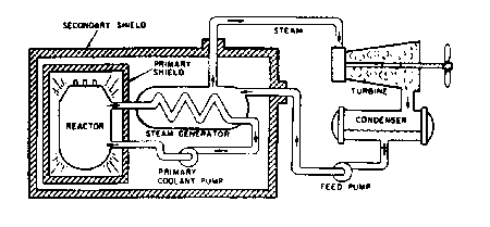 The power plant of a nuclear submarine is based upon a nuclear reactor which provides heat for the generation of steam. This steam drives the main propulsion turbines and the ship's turbo-generators for electric power.
